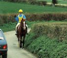 It is advisable to ride a nervous horse out in-company, position him in the middle of the ride. Wearing a caution young horse vest will make motorists give you a wider berth this is a good idea. Never split the ride to cross roads or at junctions always leave sufficient room for all to go, even if it means passing your intended exit and doing a U-turn further on, splitting the ride may lead to over anxious horses making a dash to join the others and getting killed.